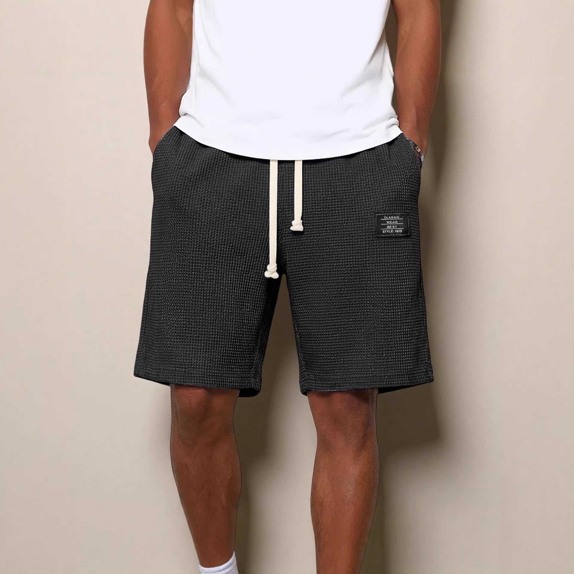 Mens Simple Waffle Knit Embroidered Casual Solid Color Shorts
