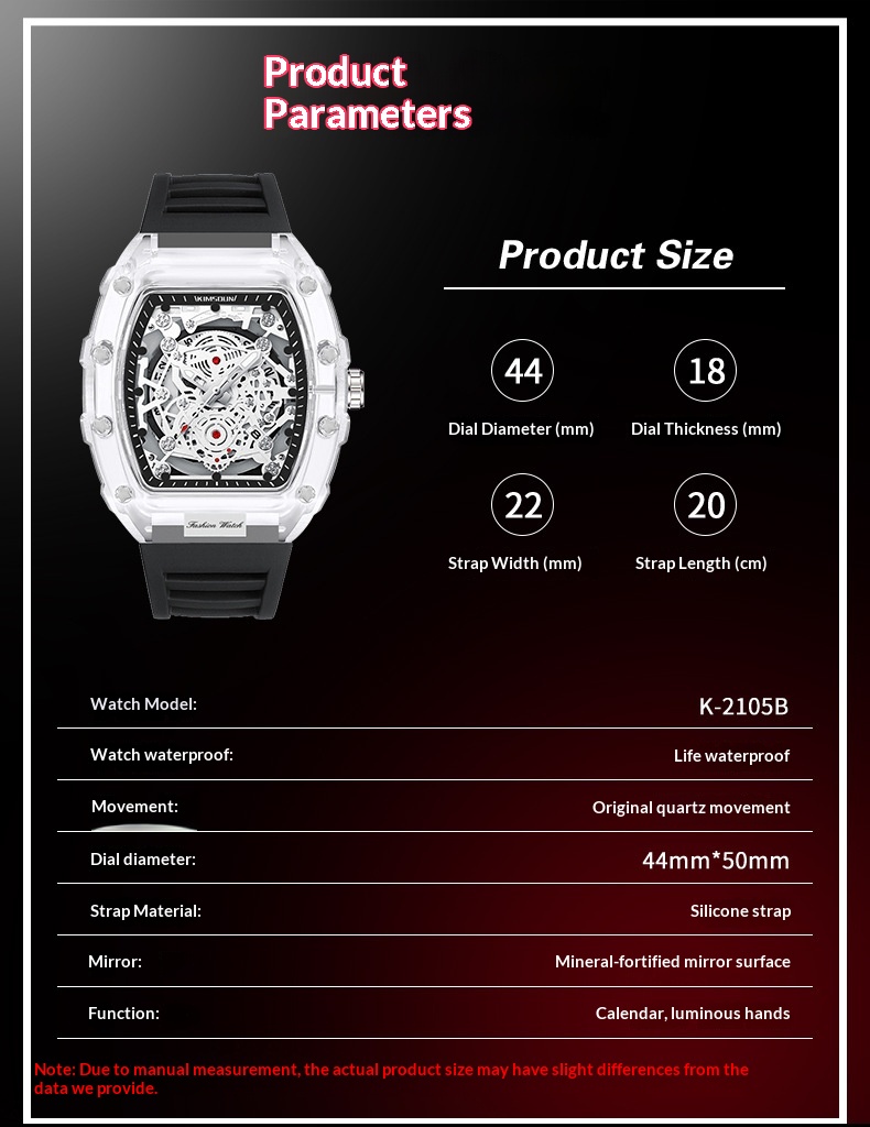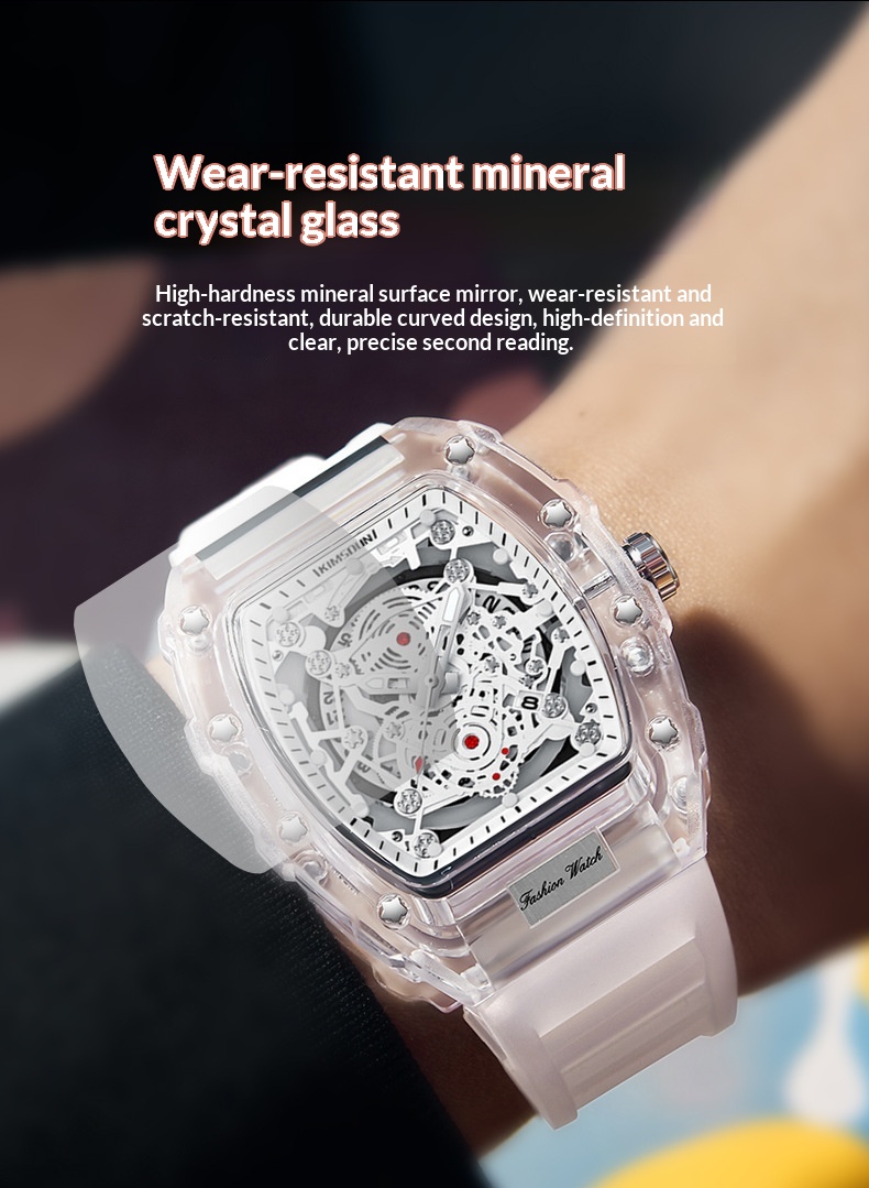 Color: Transparent white dial with a white strap, transparent black dial with a black strap, transparent red dial with a red strap, transparent yellow dial with a yellow strap, transparent blue dial with a blue strap, transparent green dial, with a green strap